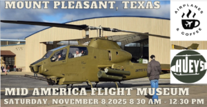 November 8, 2025 is the date for the Airplanes & Coffee event at the museum. Come walk about the historic aircraft at the Mid American Flight Museum while sipping on coffee and catching up with friends. The ramp should be full of visiting aircraft from 8am to Noon.